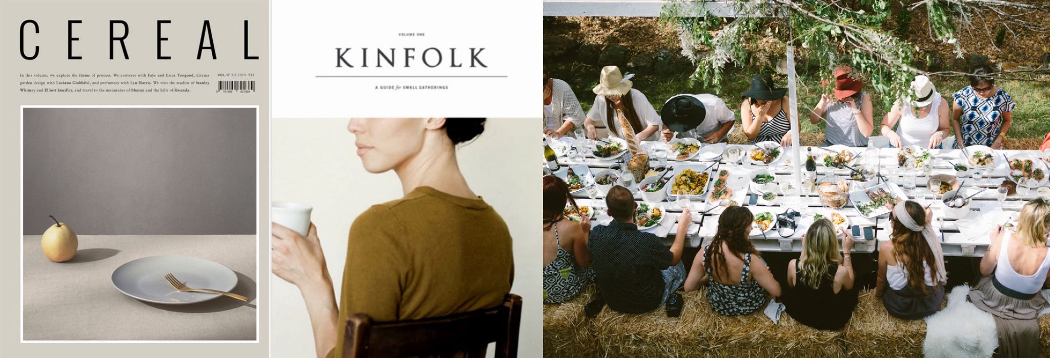 Kinfolk was almost a theatrical renunciation. By the early 2010s the creative class had decided the appropriate response to digital saturation was to pretend it could be opted out of, and the aesthetic was a cosplay of restraint and maturity — like someone just back from CDMX for the first time. The spartan shelves with one farm-to-table cook book and a hand-thrown ceramic that sparked joy.