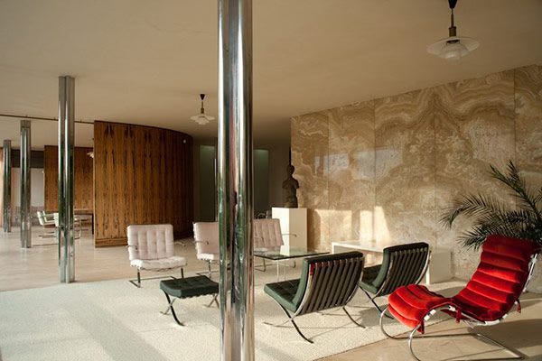 Modernism replaced ornament with utilitarian silhouette. The Bauhaus and the International Style taught a generation that the outline of the form was the design, and ornament was almost gauche. Discerning strong from weak composition became the measure of personal taste. Pragmatism was moralized. The empty wall was proof you were confident enough to be informed, unsentimental, and possessed of taste. The Barcelona chair, the Tugendhat House, the Farnsworth — each one asking, are you stoic enough to live without flourish?